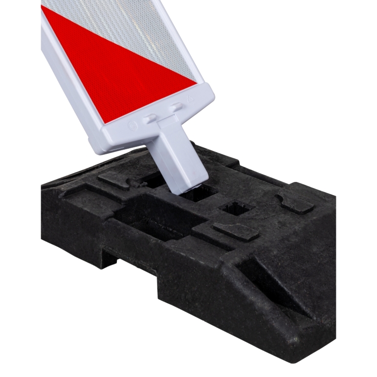 L’installation de la balise K5C est rapide et intuitive. Il suffit de l’insérer dans l’empreinte dédiée du socle de lestage 28 kg, qui assure une excellente stabilité sur tous types de surfaces (bitume, gravier, terre compactée). Les crampons antidérapants du socle renforcent l’adhérence au sol, limitant les risques de basculement liés au vent ou au passage de véhicules.