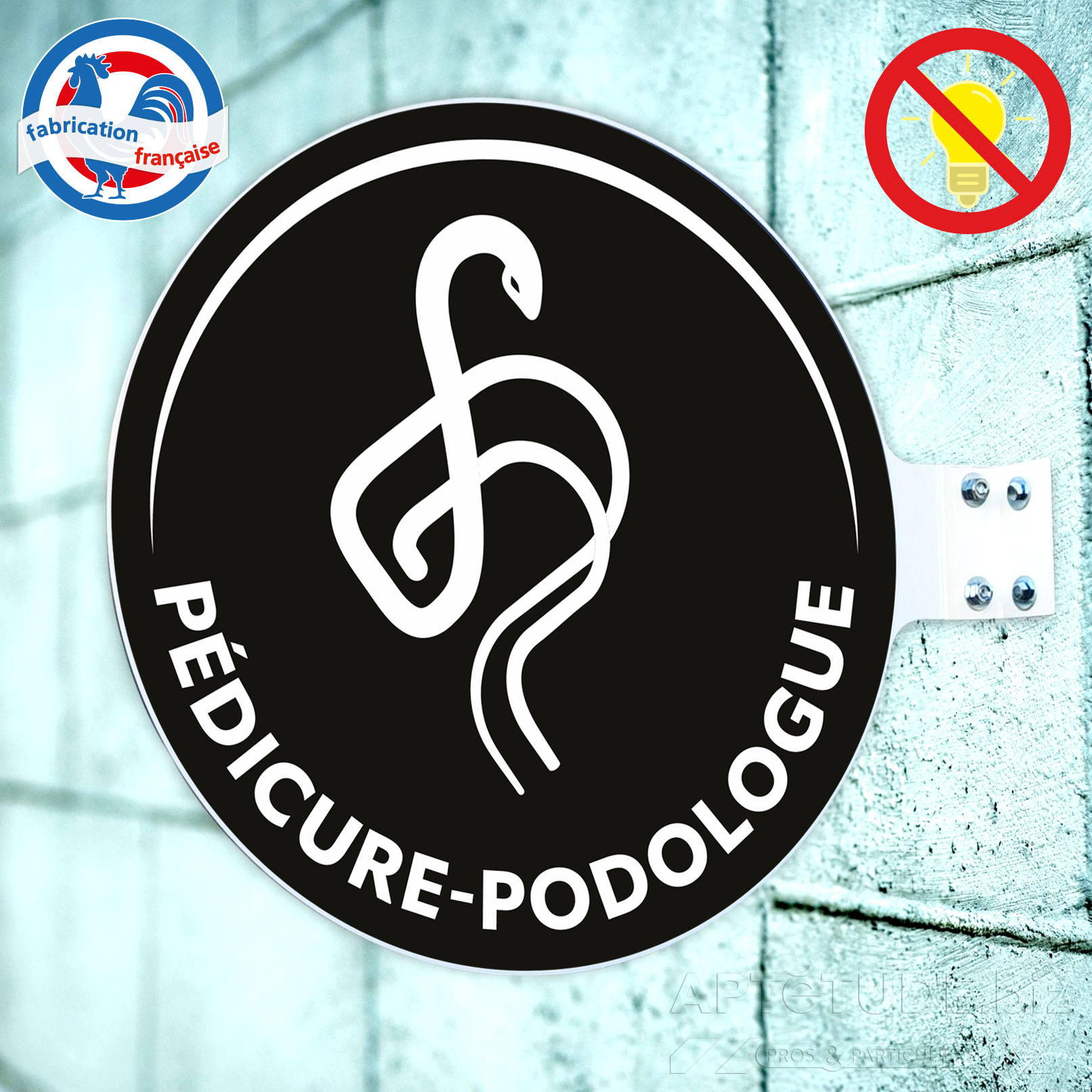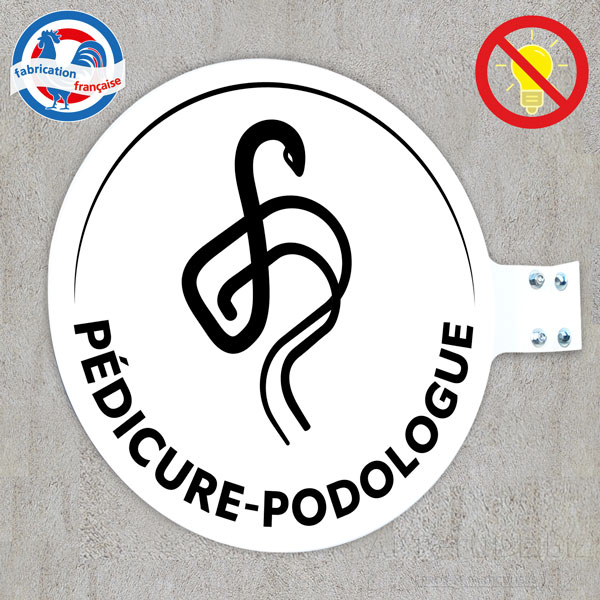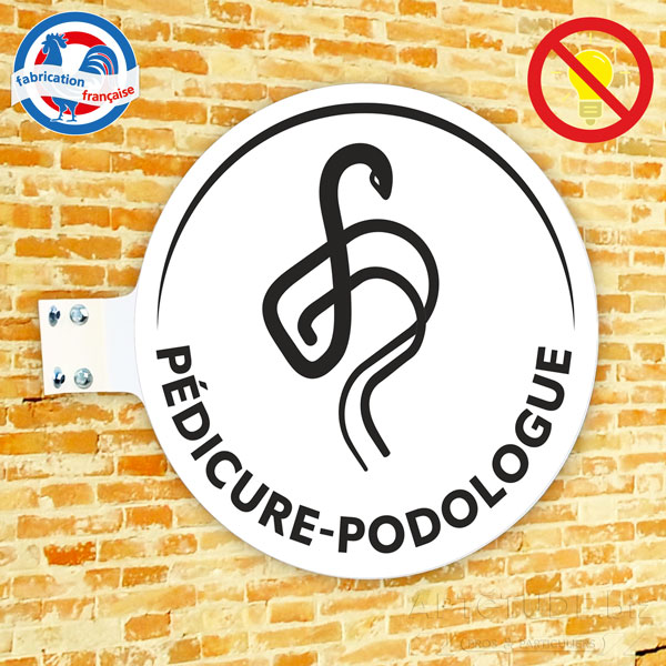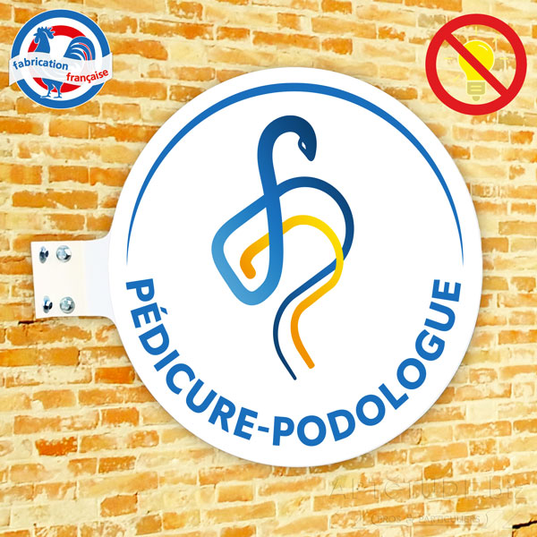 Enseigne Pédicure - Podologue avec le logo original (à privilégier) en Dibond® de la nouvelle gamme ÉkoSign, non lumineuse et en drapeau. Uniquement en ø600mm