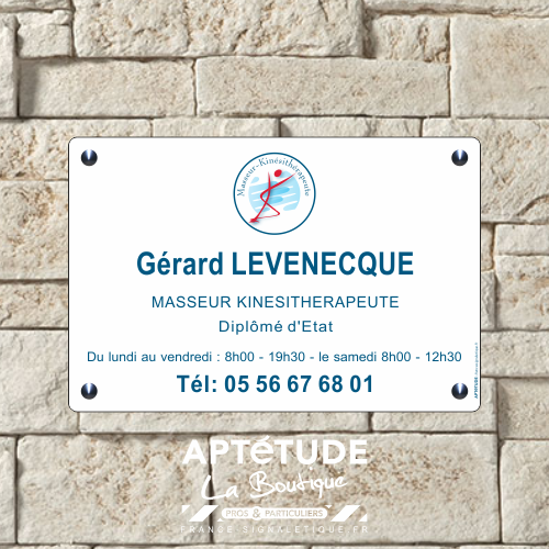 - la plaque professionnelle kiné : vous avez le droit de poser 2 plaques selon l'environnement et la disposition du cabinet.